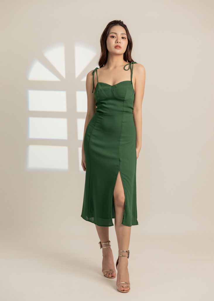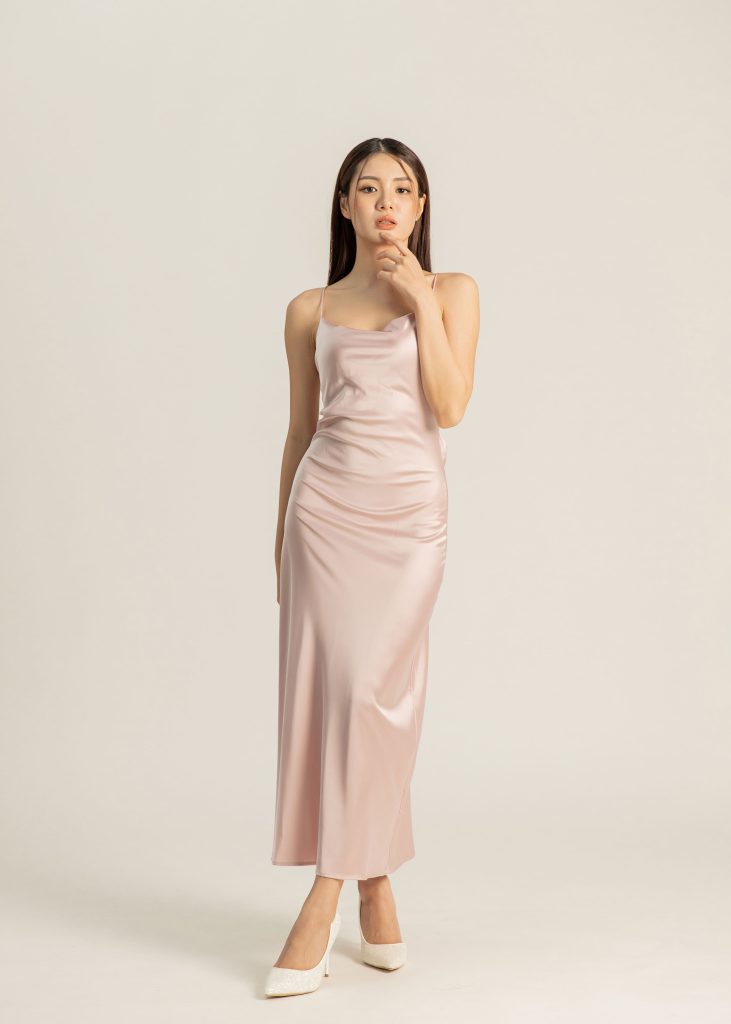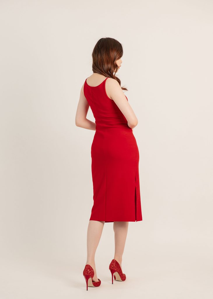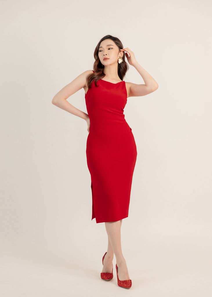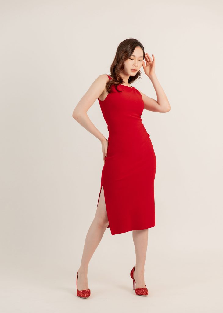 Sculpted Muse Satin Midi Gown In Crimson Red