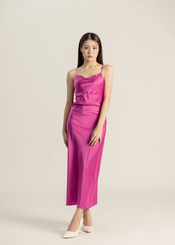 Wispy Embrace Satin Gown In Fuchsia Pink